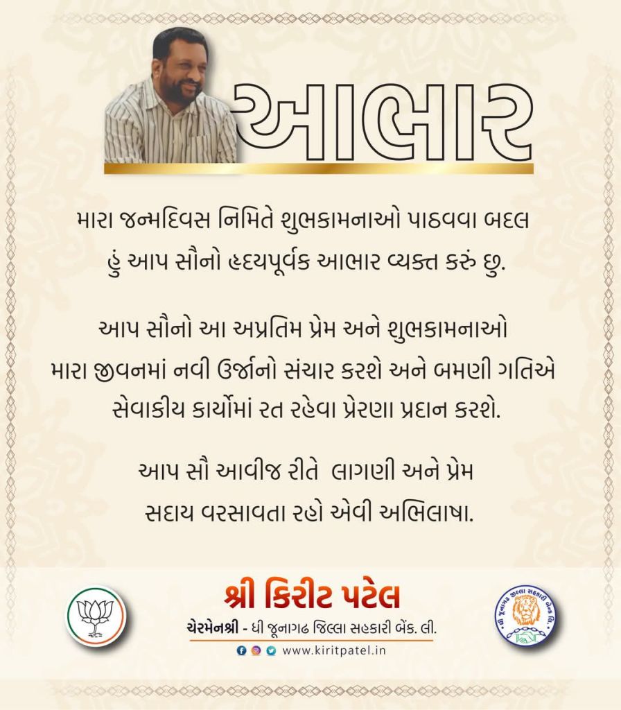 જન્મદિવસ નિમિતે શુભકામનાઓ પાઠવવા બદલ હું આપ સૌનો હૃદયપૂર્વક આભાર વ્યક્ત કરું છુ.