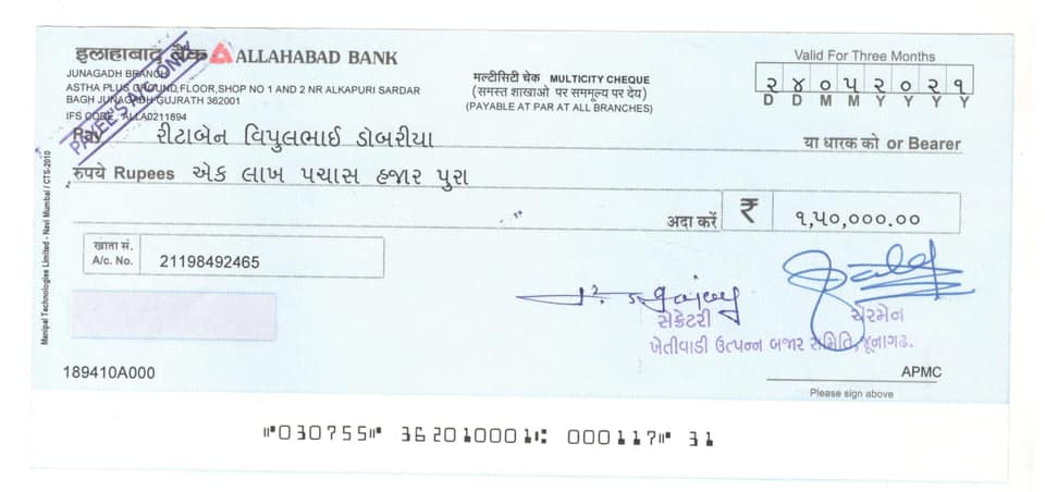 જુનાગઢ તાલુકાનાં ઈશાપુર ગામના ખેડૂત ખાતેદાર તથા મજેવડી ગામના ખેડૂત ખાતેદારનું અકસ્માતમાં અવસાન થતાં શ્રી ખેતીવાડી ઉત્પન્ન બજાર સમિતિની અકસ્માત વીમા યોજના અંતર્ગત રૂપિયા ૧,૫૦,૦૦૦/- ના ચેક અપૅણ કરવામાં આવેલ.