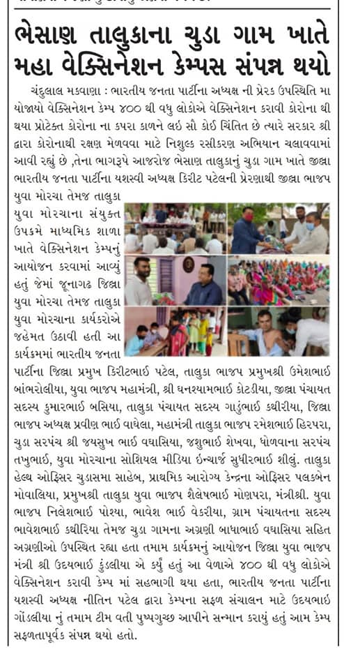 બીલખા ખાતે આવેલ પટેલ સમાજ વાડી ખાતે જુનાગઢ તાલુકા ભાજપ યુવા મોરચા દ્વારા મહારક્તદાન કેમ્પ નું આયોજન કરવામાં આવ્યું હતું.