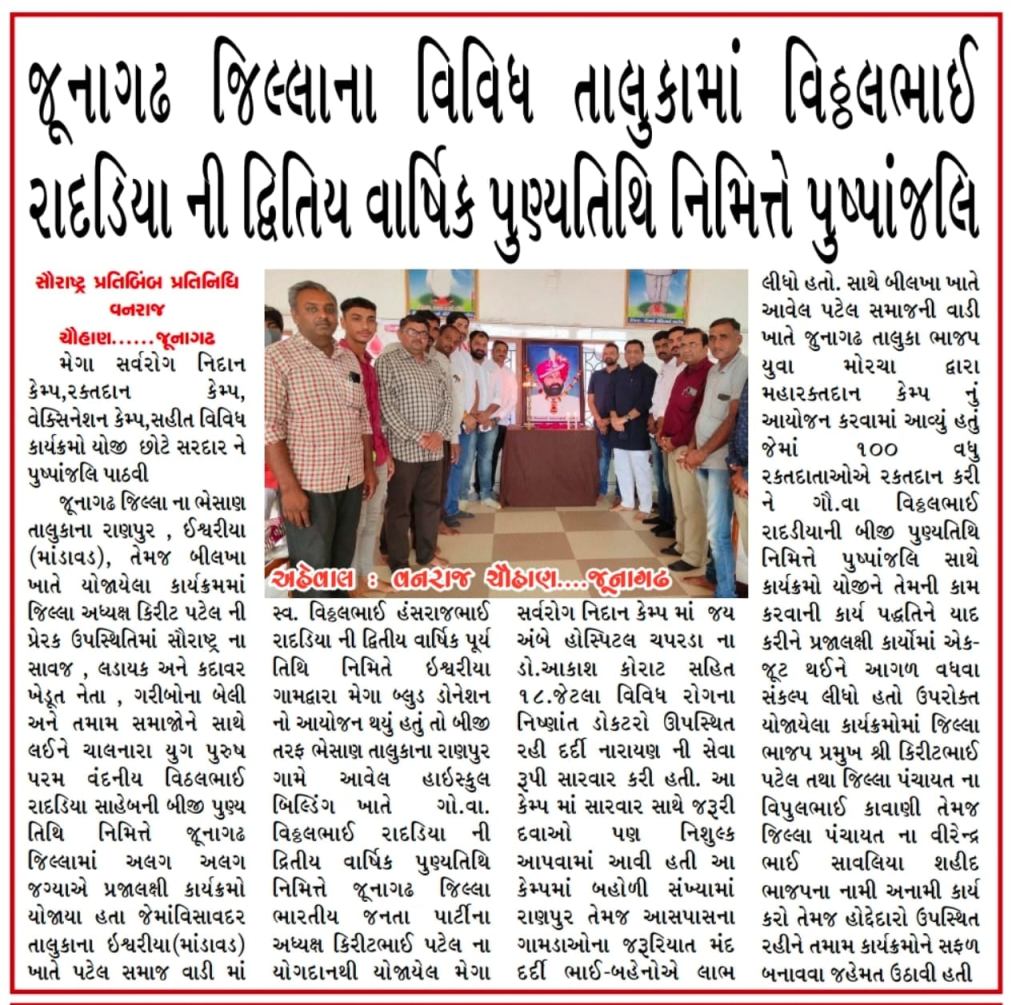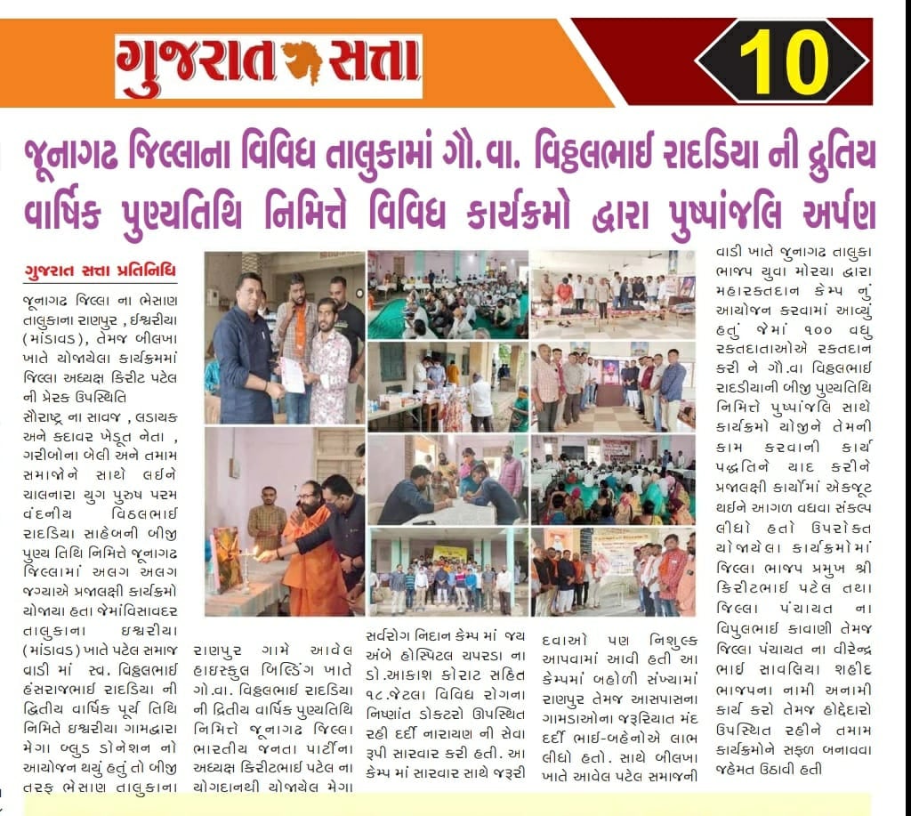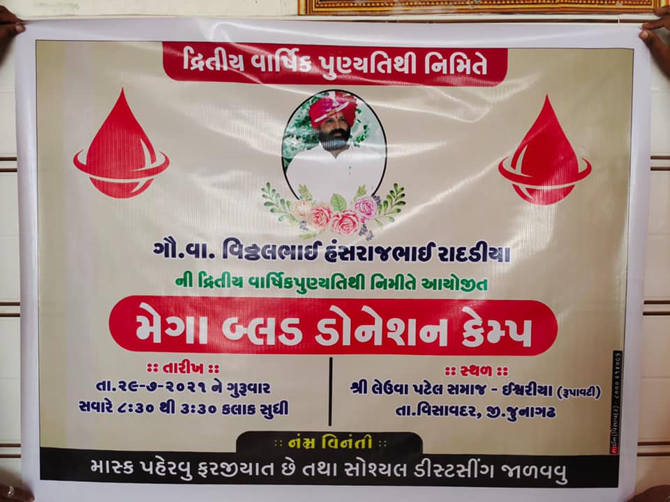 વિસાવદર તાલુકાના ઈશ્વરીયા માડાવડ ગામે ગો.વા. વિઠ્ઠલભાઈ રાદડિયા ની દ્રિતીય વાર્ષિક પુણ્યતિથિ નિમિત્તે મેગા બલ્ડ ડોનેશન કેમ્પ યોજવામાં આવ્યો.