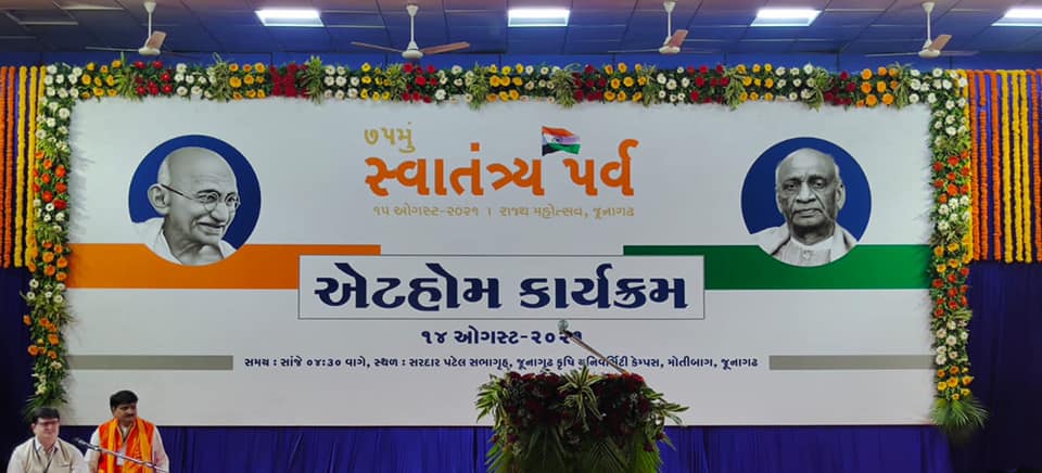 જુનાગઢ ખાતે ૭૫ મો રાજ્ય મહોત્સવ અંતર્ગત ‘એટ હોમ’ કાર્યક્રમ યોજાયો જેમા ગુજરાતના માન.રાજ્યપાલશ્રી આચાર્ય દેવવ્રતજી રાજ્યના મુખ્યમંત્રી શ્રી. વિજયભાઈ રૂપાણીજી મુખ્ય મહેમાન તરીકે ઉપસ્થિત હતા.