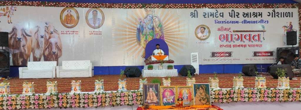 આજરોજ વિસાવદર તાલુકાના શ્રી રામદેવ પીર આશ્રમ, નીલકંઠ ધામ લીમધ્રા (ગીર) ખાતે આયોજીત શ્રીમદ્ ભાગવત સપ્તાહ જ્ઞાનયજ્ઞ પારાયણ ના આયોજનના નિમંત્રણને માન આપી, વક્તા શ્રી મહાદેવ પ્રાસાદ મહેતાજીના કંઠે ભાગવત સપ્તાહનું રસપાન કરવાનો અવસર મળ્યો.
