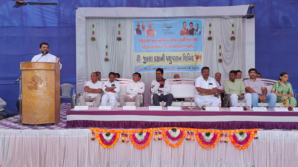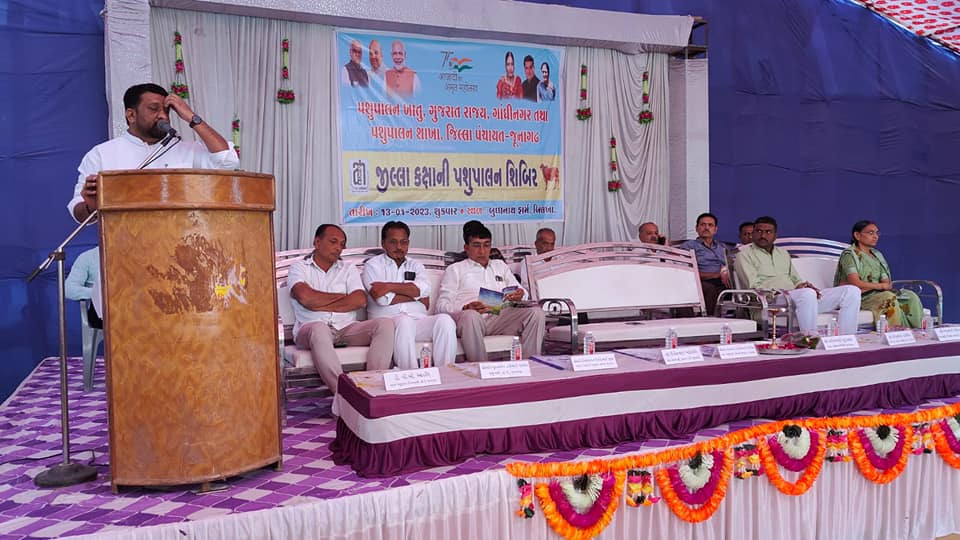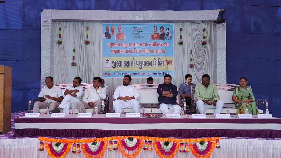 આજરોજ જૂનાગઢ તાલુકાના બીલખા ગામે બુદ્ધનાથ ફાર્મ ખાતે ગુજરાત રાજ્ય પશુપાલન ખાતું, ગાંધીનગર તથા પશુપાલન શાખા, જીલ્લા પંચાયત જુનાગઢ દ્રારા જીલ્લા કક્ષાની પશુપાલન શિબિર સાવજ ડેરીના ચેરમેન દિનેશભાઈ ખટારીયાના અઘ્યક્ષ સ્થાને યોજવામાં આવી, જેમાં બીલખા સહિત આસપાસના વિસ્તારના પશુપાલકોએ શિબિરનો લાભ લીધો હતો.આ શિબિરમાં પશુ તજજ્ઞો દ્વારા પશુપાલન વિશે માર્ગદર્શન પણ આપવામાં આવ્યુ હતું,જેમાં સાંસદ રાજેશભાઈ ચુડાસમા સાથે ઉપસ્થિત રહી જરુરી માર્ગદર્શન આપેલ.