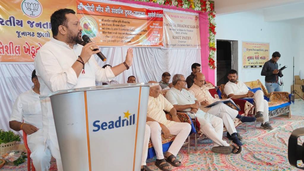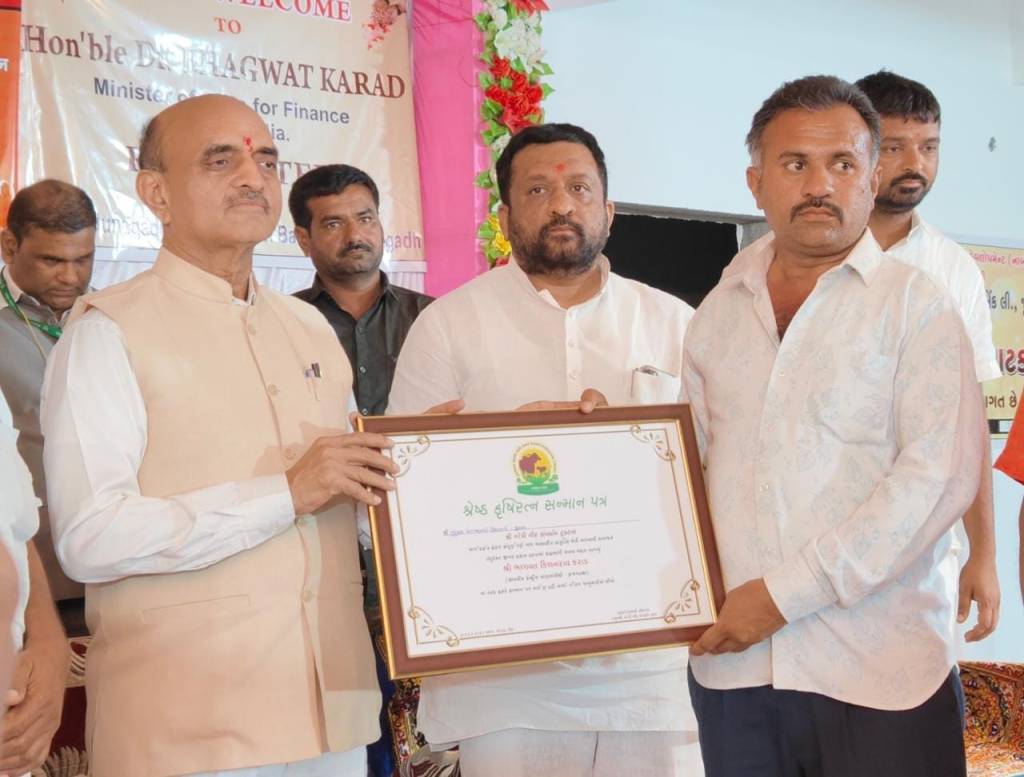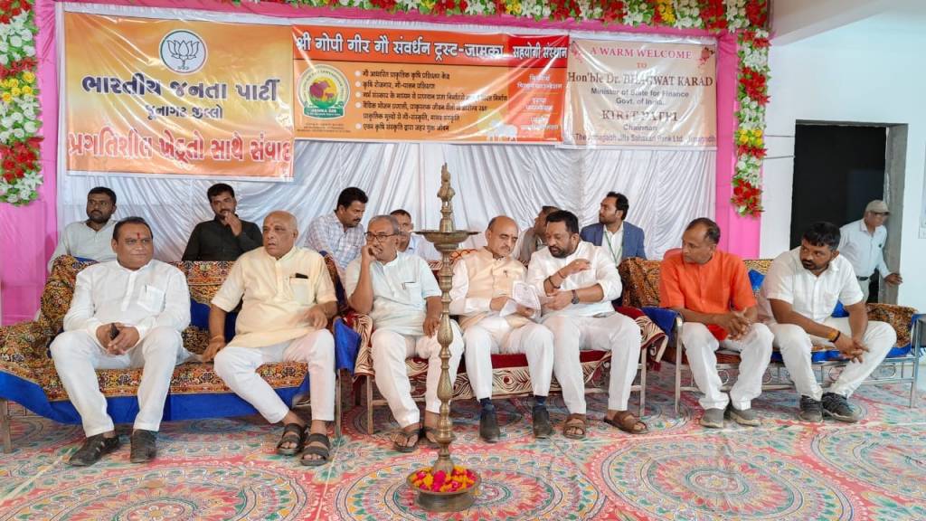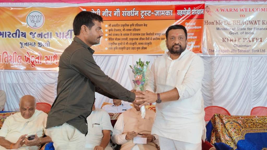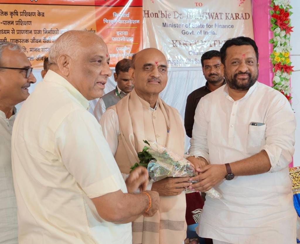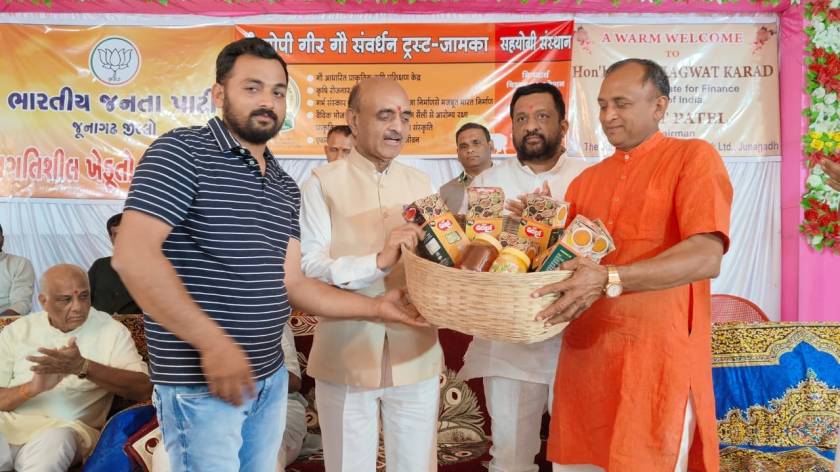 આજરોજ જૂનાગઢ તાલુકાના જામકા ગામે “શ્રી ગોપી ગીર ગૌ સંવર્ધન ટ્રસ્ટ” ખાતે કેન્દ્રીય ફાઈનાન્સ મિનિસ્ટર શ્રી ડો. ભાગવત કરાડ સાહેબની ઉપસ્થિતિમાં ધી. જૂનાગઢ જિલ્લા સહકારી બેંક ના સહયોગથી પ્રગતિશીલ ખેડૂતો સાથે સંવાદ કાર્યક્રમ યોજાયો જેમાં હાજરી આપી પ્રગતીશીલ ખેડૂતોનું સન્માન કરવાની સાથે સરકારશ્રીની વિવિધ કલ્યાણકારી કૃષિ લક્ષી યોજનાઓ અંગે માર્ગદર્શન આપેલ.