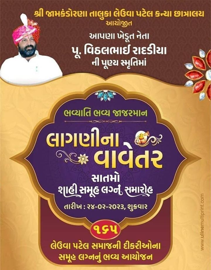આજરોજ શ્રી જામકંડોરણા તાલુકા લેઉવા પટેલ કન્યા છાત્રાલય આયોજિત ખેડૂત નેતા પૂ. વિઠ્ઠલભાઈ રાદડિયાની પૂણ્ય સ્મૃતિમાં યોજાયેલ ભવ્યતિ ભવ્ય જાજરમાન “લાગણીના વાવેતર” સાતમા શાહી સમુહ લગ્નોત્સવ અંતર્ગત શ્રી જયેશભાઈ રાદડીયા દ્વારા કરાયેલા આયોજનમાં હાજરી આપી.
