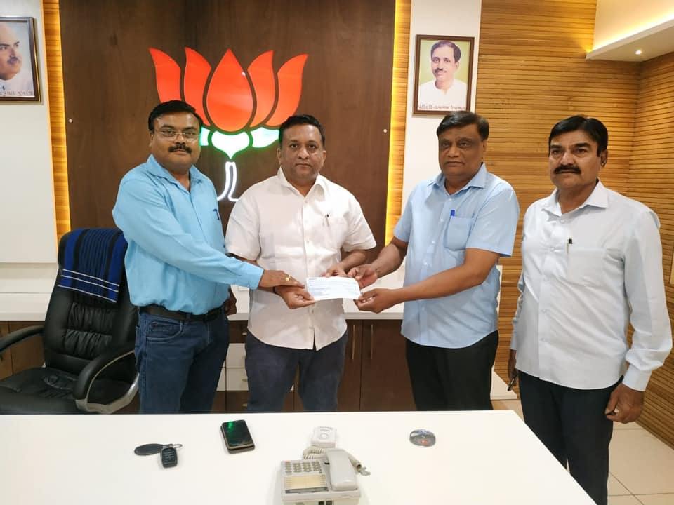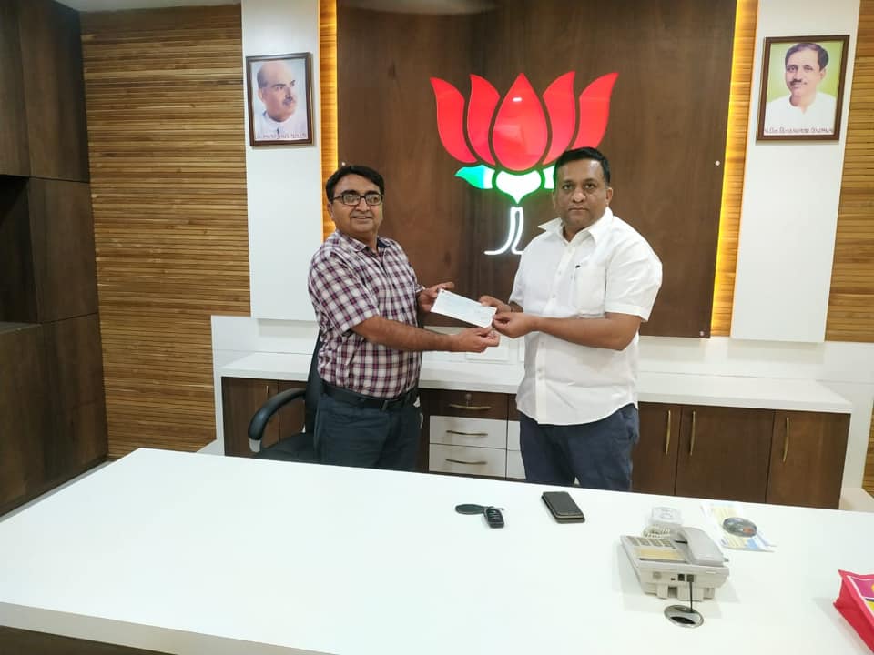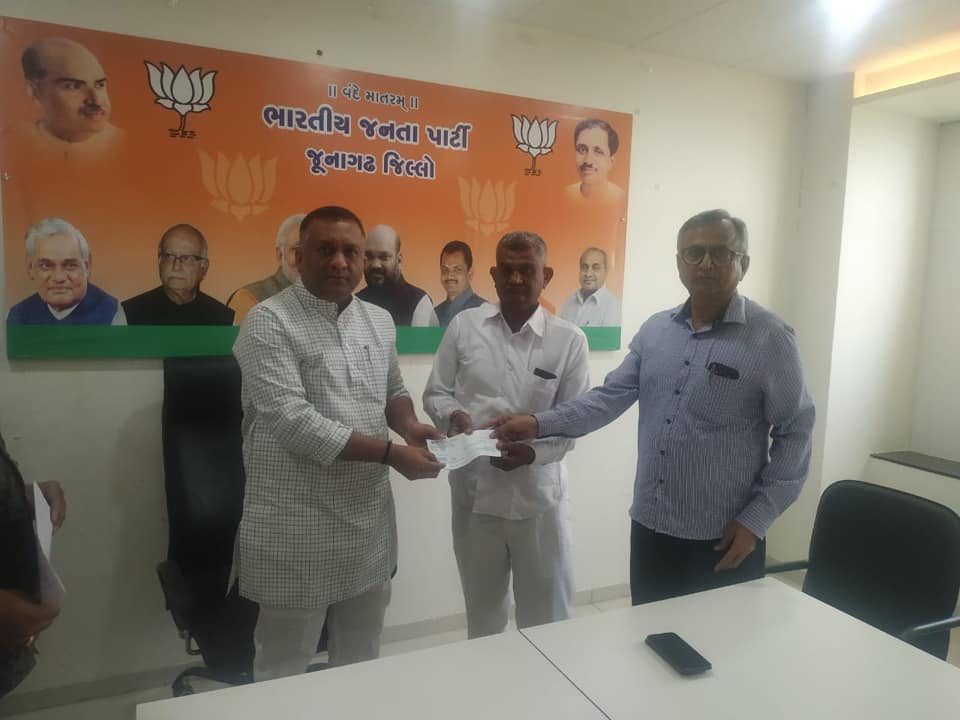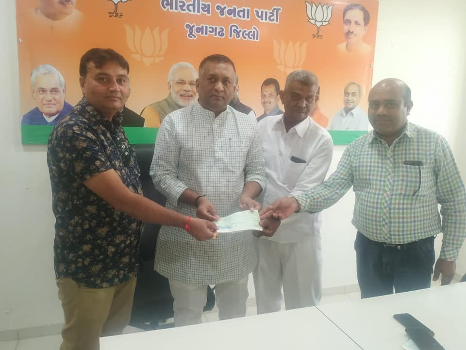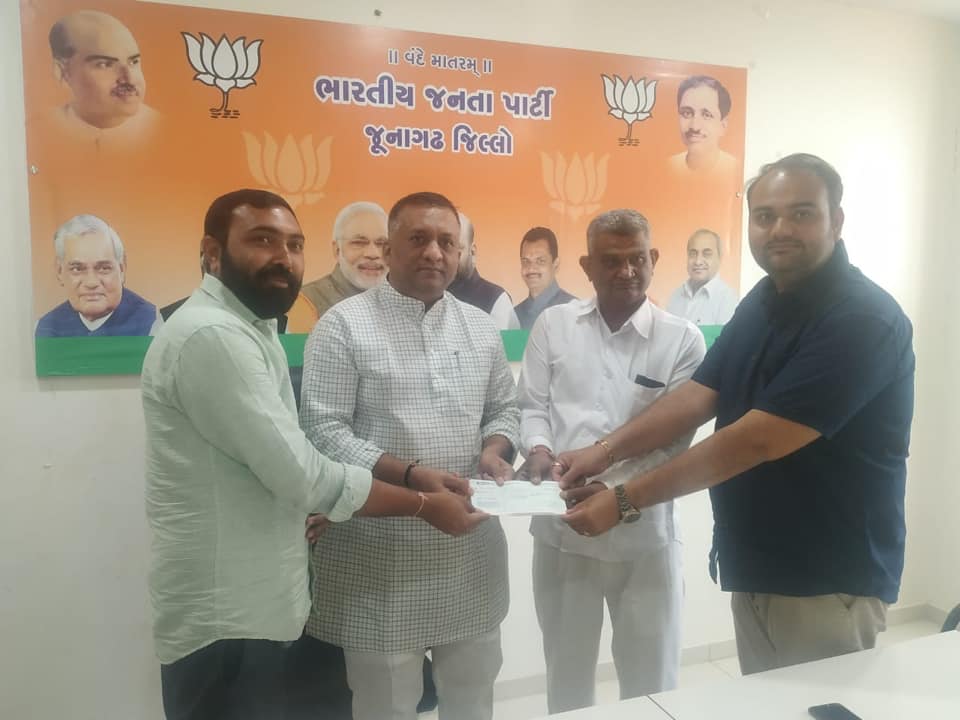 કોરોના ની મહામારી સામે લડવા જૂનાગઢ જિલ્લા ભારતીય જનતા પાર્ટી ના કાર્યકર્તાઓ અને શુભેચ્છકો દ્વારા જિલ્લા ભાજપ કાર્યાલય પર જે ચેકો મુખ્યમંત્રી રાહત ફંડ માં આપવામાં આવી રહ્યા હતા, જેને માન.મુખ્યમંત્રીશ્રી વિજયભાઈ રૂપાણી સાહેબ ને અર્પણ કરેલ.
